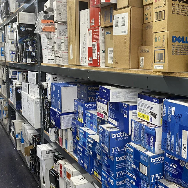 Extensive stock of ink and toner supplies for multiple printer models and brands.